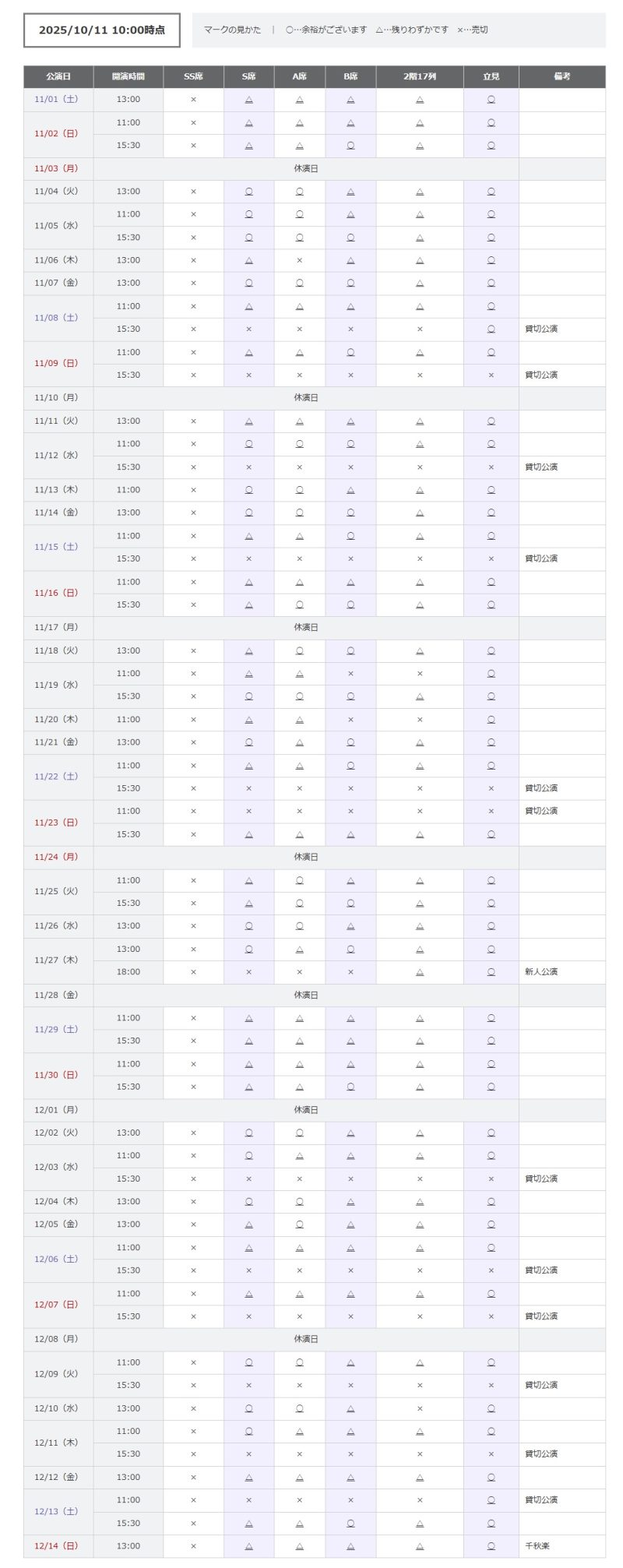 一般前売日当日の状況です。10:10時点で初日、千秋楽は完売。
